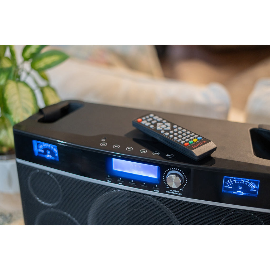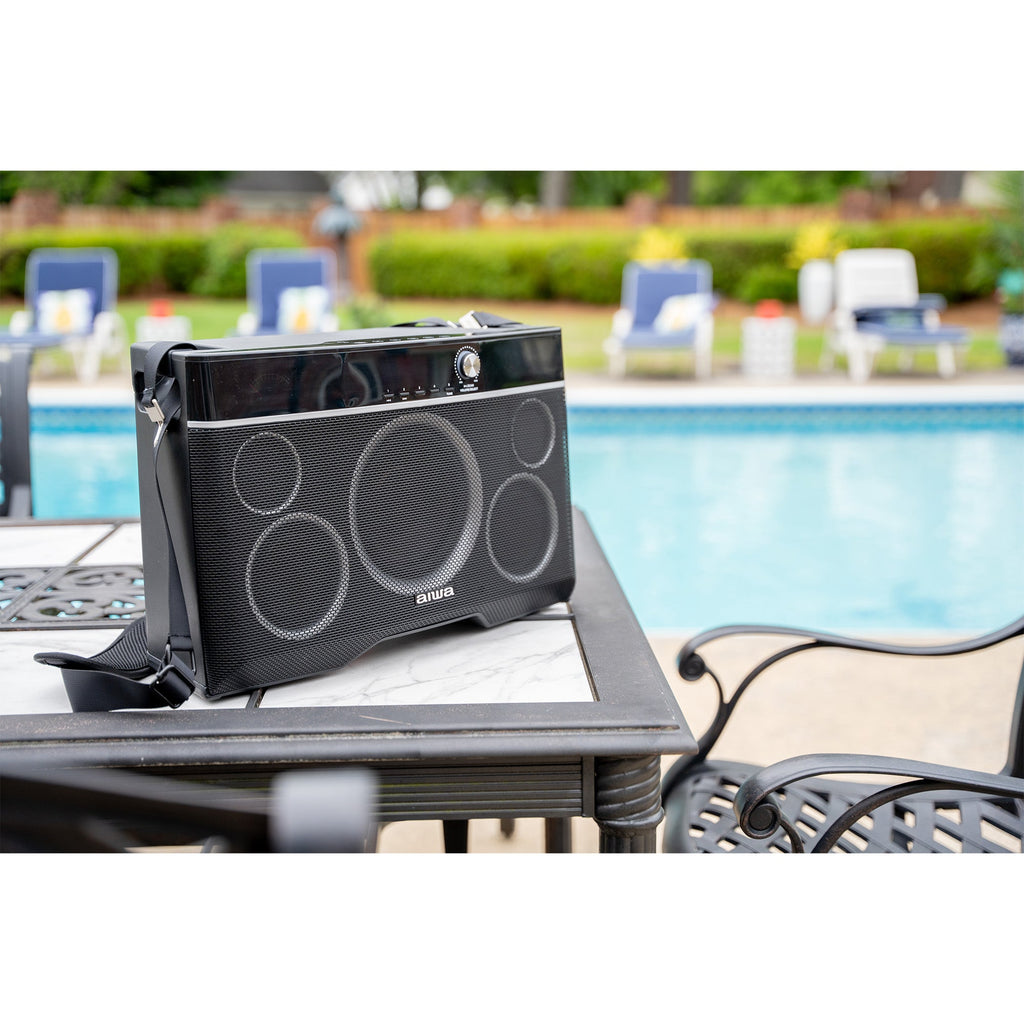 The Aiwa Exos-10 Wireless Speaker is the perfect combination of advanced sound with a retro design and feel. The Exos-10 offers exceptional Hi-Fi sound and exhibits a stylish, nostalgic look that makes for a great addition to any living space. Experience powerful, rich and clear sound all day long with up to 12 hours of battery life on one charge or unlimited playtime via wall power. Listen to your favorite music through Bluetooth connection and AUX playback or switch to radio and enjoy your top stations with analog style FM tuning. Enhance your audio experience with the party sync feature that allows you to pair over 100 speakers together! The Exos-10 is the ultimate Hi-Fi speaker that partners the retro design aesthetic with superior modern sound.